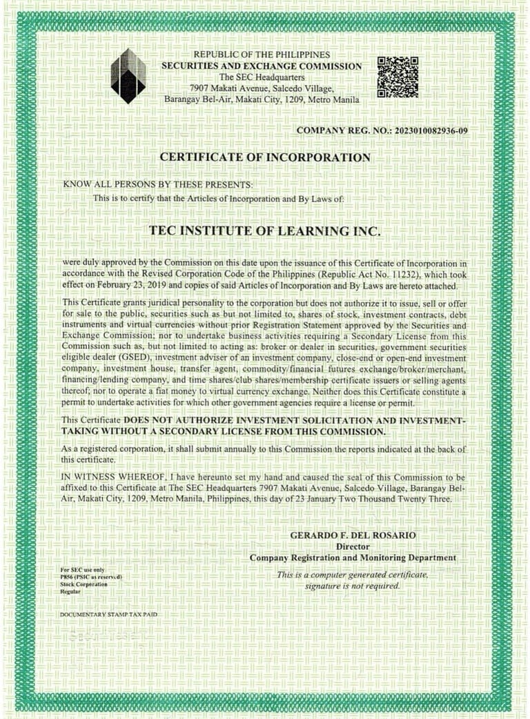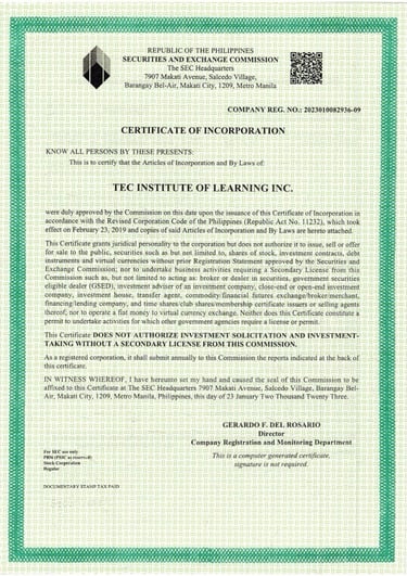materializes in the incorporation of TeC Institute of Learning Inc.